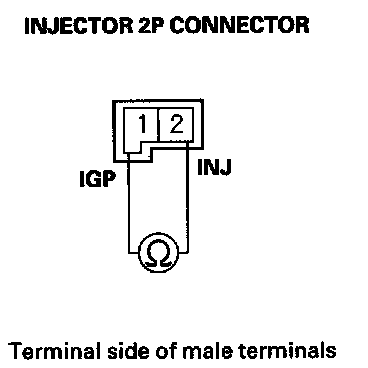 56. Measure resistance between injector 2P connector terminals No. 1 and No. 2.