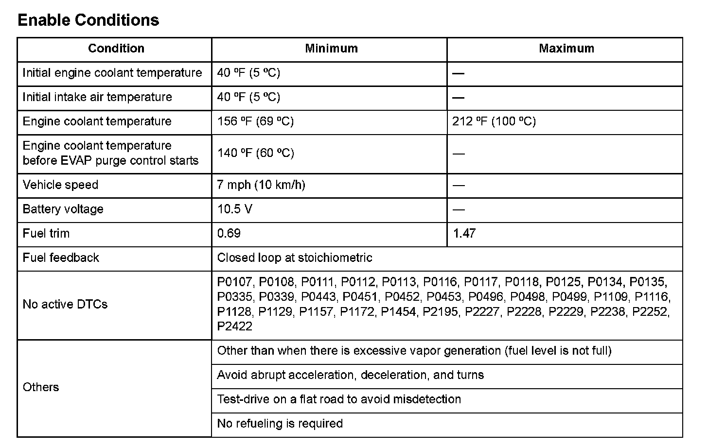 - The output from the fuel tank pressure sensor is -0.5 kPa (-0.15 in.Hg, -4 mmHg) or more for at least 45 seconds.