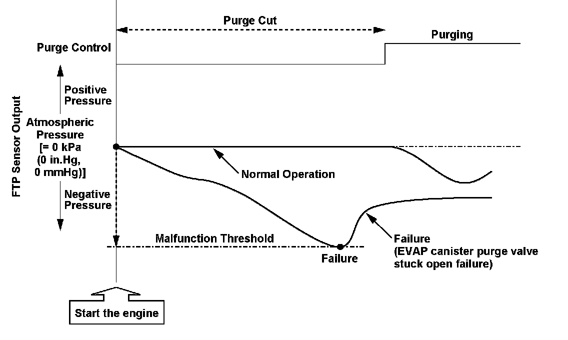 The engine control module (ECM)/powertrain control module (PCM) adjusts the amount of fuel vapor sent to the engine by controlling the evaporative emission (EVAP) canister purge valve. If the EVAP canister purge valve is stuck open, engine vacuum flows into the purge line before purge control starts when starting the engine. The ECM/PCM monitors the fuel tank pressure (FTP) sensor output when purge control starts. If the FTP sensor output indicates negative pressure, the ECM/PCM detects a malfunction in the EVAP canister purge valve, and a DTC is stored.