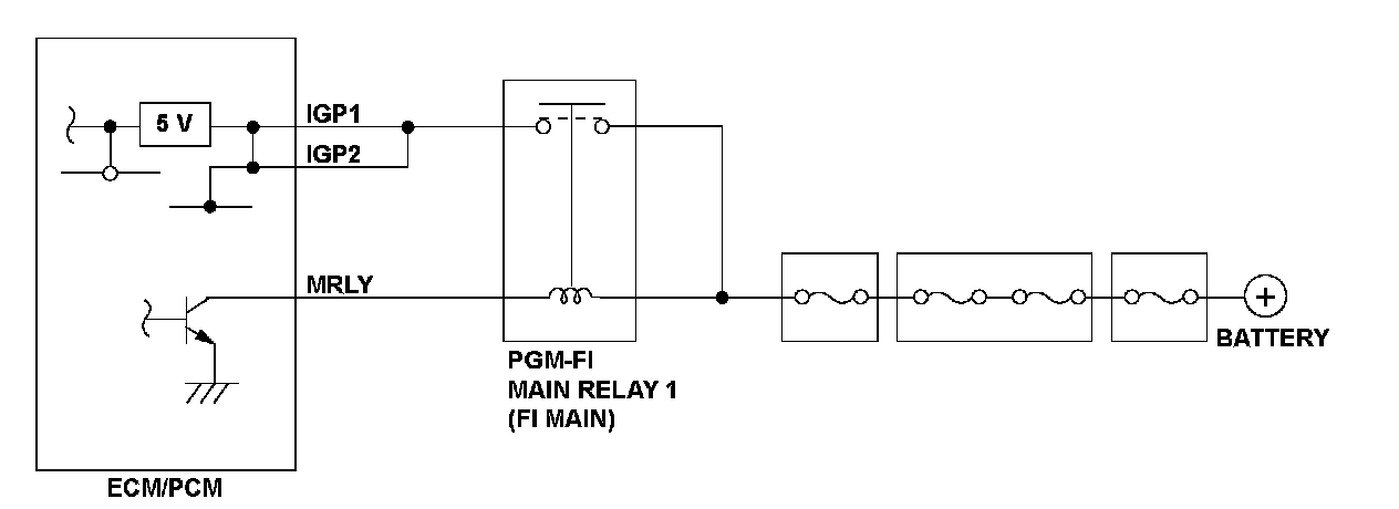 If there is a short to ground in the harness between the engine control module (ECM)/powertrain control module (PCM) and the PGM-FI main relay 1 (FI MAIN), the PGM-FI main relay 1 (FI MAIN) stays ON even though the ignition switch is OFF, and the ECM/PCM remains active. However, the engine is not running because the power for the gauges, the ignition, and the fuel pump is turned OFF by the ignition switch.