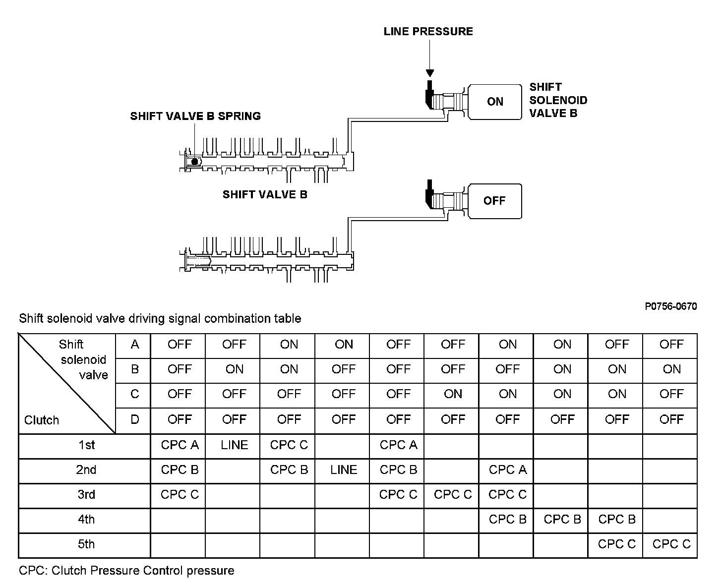 Shift solenoid valve B is installed in the transmission housing. It is controlled by the ON/OFF signal from the powertrain control module (PCM), to apply line pressure to shift valve B. The signal from the PCM is output to apply clutch pressure control pressure to the proper gear change clutch according to the gear change schedule. When the signal to shift solenoid valve B from the PCM is ON, and line pressure is applied to shift valve B, it operates against the shift valve B spring. When the signal to shift solenoid valve B from the PCM is OFF, and line pressure is discharged, shift valve B is inactive. The PCM monitors the input shaft (mainshaft) speed and the output shaft (countershaft) speed at the gear change determined by the shift schedule. When an improper gear ratio is output compared to the predetermined gear change mode, a shift solenoid valve B ON failure is detected and a DTC is stored.