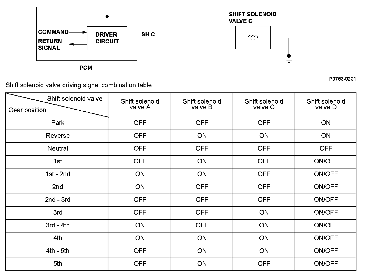 When shift solenoid valves A, B, C, and D are turned ON, the hydraulic pressure circuit opens. The hydraulic pressure circuit supplies/discharges hydraulic pressure to/from each clutch according to the combination of the ON/OFF status of those valves and the shift valves. The powertrain control module (PCM) commands the driver circuit to turn on the shift solenoid valve. The circuit diagnoses malfunctions such as a circuit short or open, and sends back a return signal during the PCM's command. When the return signal does not match the PCM command, a malfunction is detected by the PCM. The malfunction is detected when the return signal does not match the PCM command to turn ON the shift solenoid valve, and a DTC is stored.