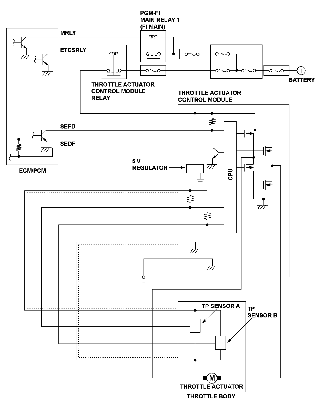 The ECM/PCM determines the throttle valve target position according to the signal received and operates the throttle actuator to move the throttle valve to the target position. The actual throttle valve position is determined by TP sensor A installed in the throttle body.