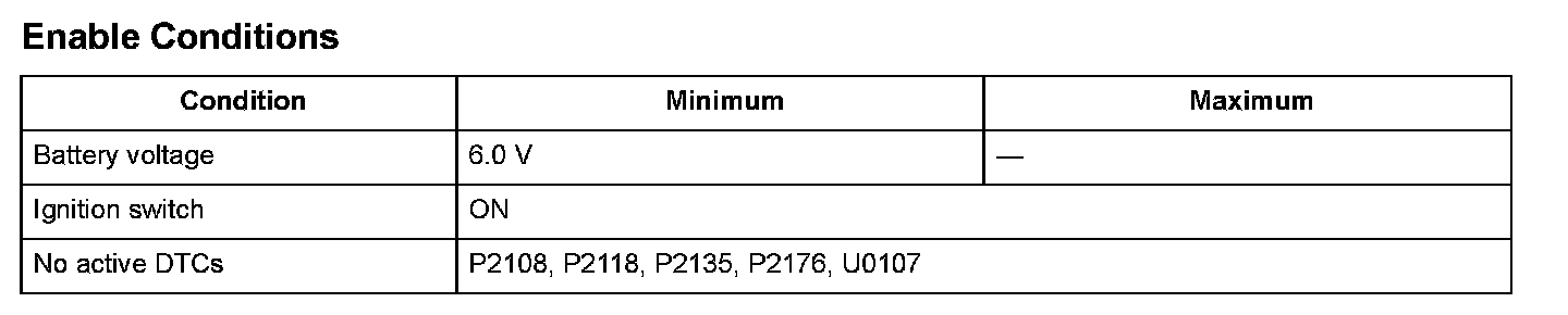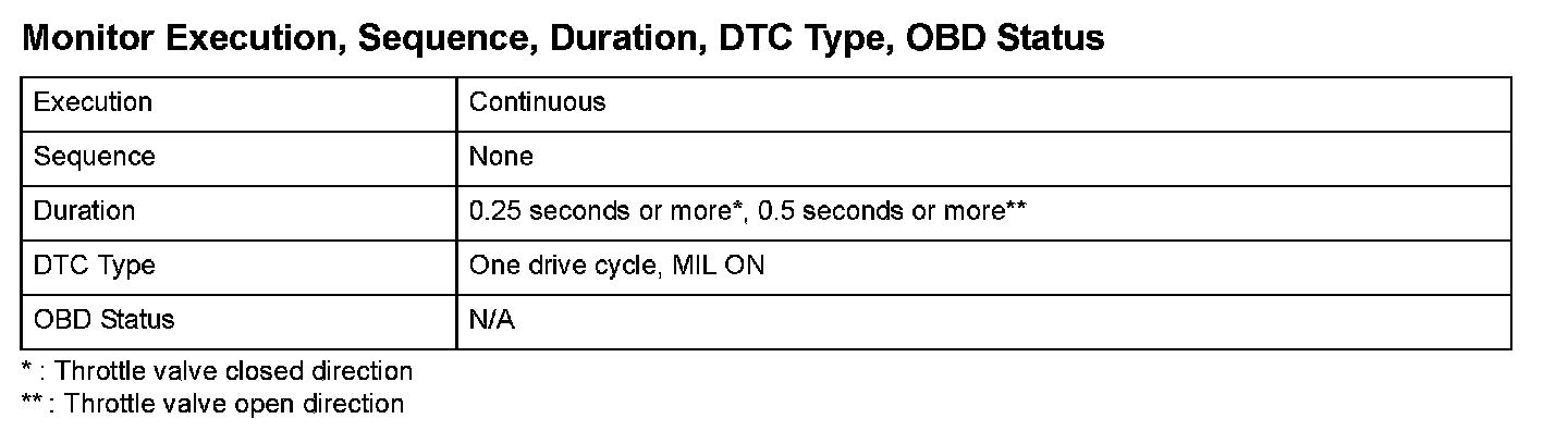 The ECM/PCM compares the throttle valve target opening angle and the actual throttle valve opening angle from TP sensor A, and when the difference exceeds the specification, the ECM/PCM detects the malfunction of the throttle actuator system and a DTC is stored.