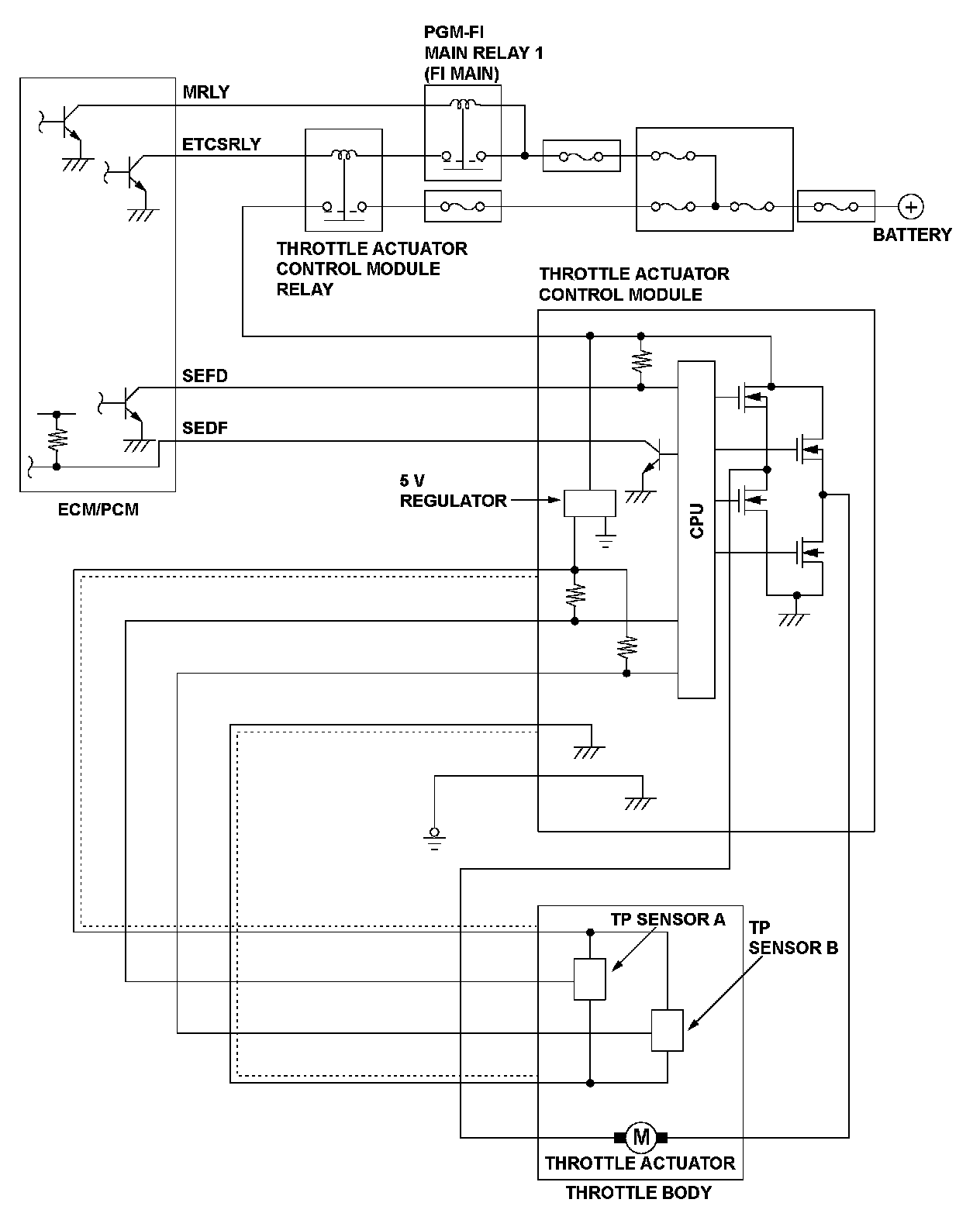 The electronic throttle control system (ETCS) controls the throttle valve opening. The system is composed of the throttle actuator, the throttle valve, throttle position (TP) sensors A and B, the throttle actuator control module, the throttle actuator control module relay, the accelerator pedal position (APP) sensor, and the engine control module (ECM)/powertrain control module (PCM).