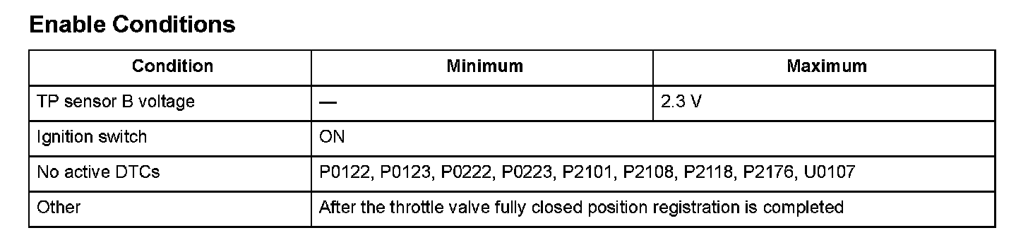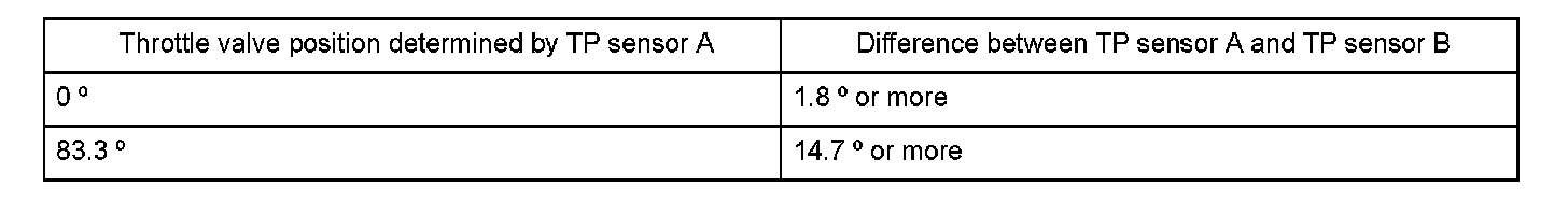 - The difference between the throttle valve positions that TP sensor A and TP sensor B determined exceeds the value shown in this table.