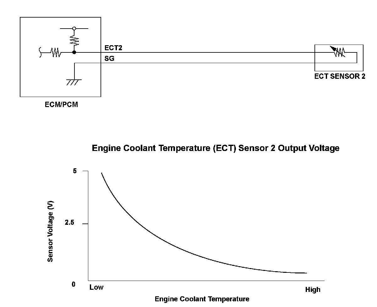 The engine coolant temperature (ECT) sensor 2 is a thermistor attached to the radiator. The ECM/PCM applies voltage (about 5 V) to the ECT2 signal circuit through a pull up resistor. As the engine coolant temperature cools, ECT sensor 2 resistance increases, and the ECM/PCM detects a high signal voltage. As the engine coolant warms, the sensor resistance decreases, and the ECM/PCM detects a low ECT2 signal voltage.