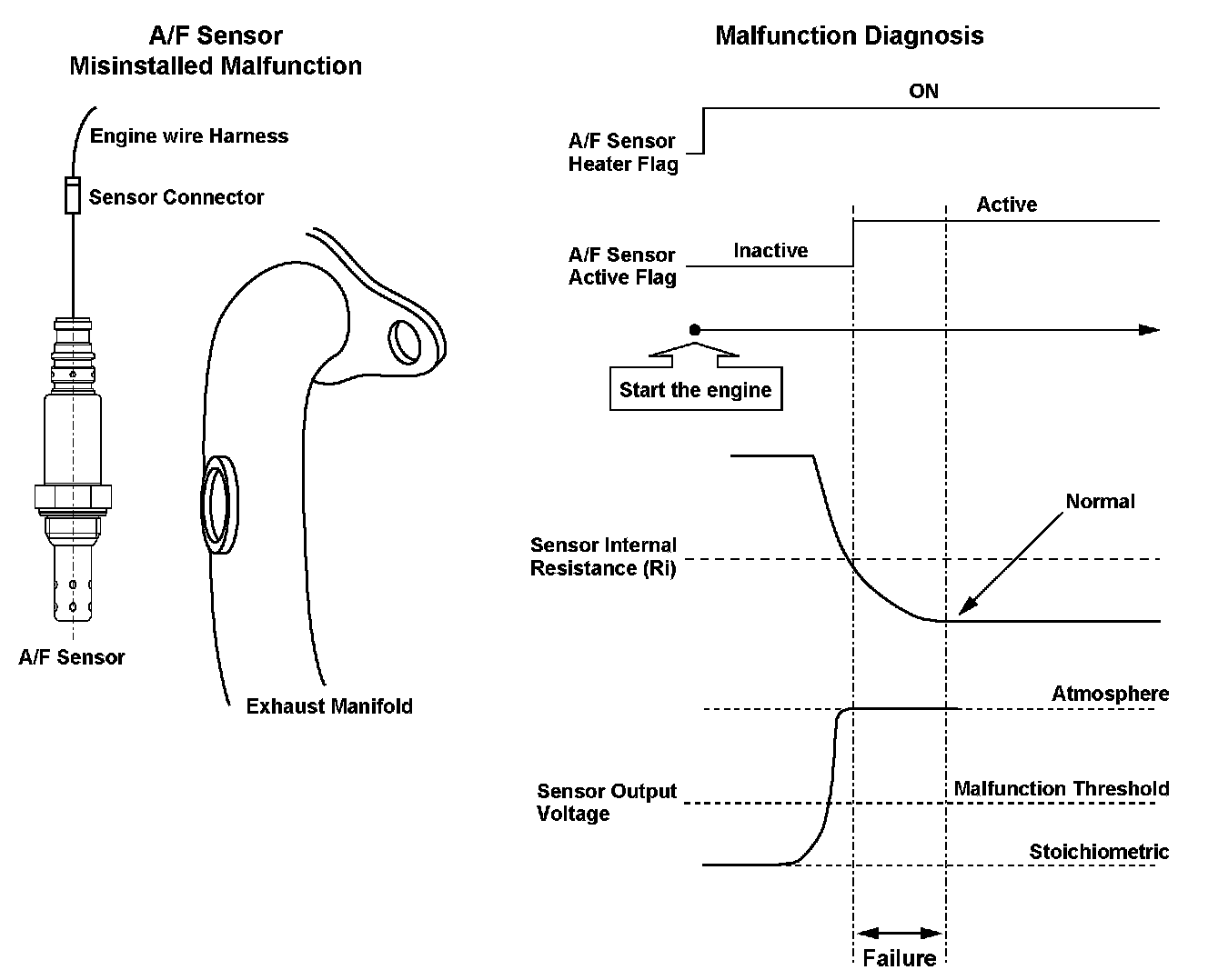 When the A/F sensor output stays out of the normal range after the A/F sensor becomes active, the engine control module (ECM)/powertrain control module (PCM) detects that the A/F sensor is not properly installed and a DTC is stored.