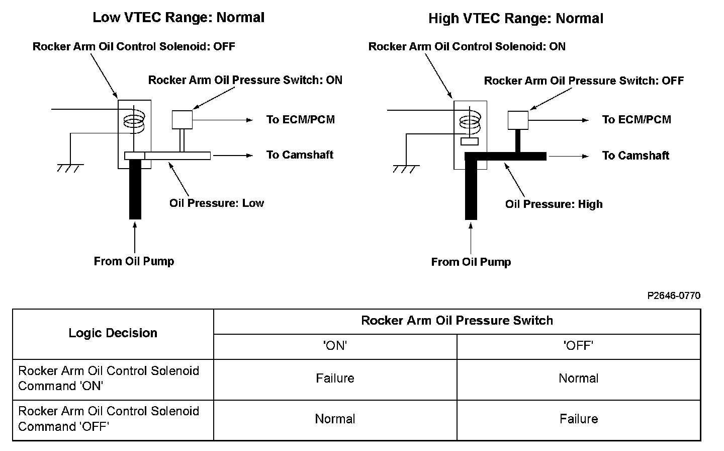 The VTEC system activates the rocker arm oil control solenoid by command from the engine control module (ECM)/power-train control module (PCM), and it charges/discharges the hydraulic circuit of the VTEC mechanism that switches valve timing between Low and High. The ECM/PCM monitors oil pressure in the hydraulic circuit of the VTEC mechanism using the rocker arm oil pressure switch downstream of the rocker arm oil control solenoid. If there is a difference between the oil pressure condition in the hydraulic circuit that is determined by the ECM/PCM command and the oil pressure condition that is determined by the status of the rocker arm oil pressure switch, the system is considered faulty, and a DTC is stored.