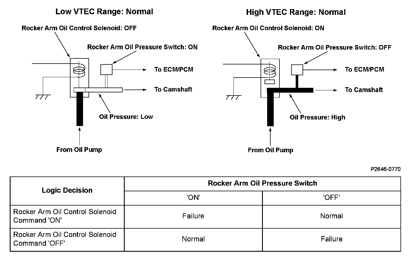 The VTEC system activates the rocker arm oil control solenoid by command from the engine control module (ECM)/power-train control module (PCM), and it charges/discharges the hydraulic circuit of the VTEC mechanism that switches valve timing between Low and High. The ECM/PCM monitors oil pressure in the hydraulic circuit of the VTEC mechanism using the rocker arm oil pressure switch downstream of the rocker arm oil control solenoid. If there is a difference between the oil pressure condition in the hydraulic circuit that is determined by the ECM/PCM command and the oil pressure condition that is determined by the status of the rocker arm oil pressure switch, the system is considered faulty, and a DTC is stored.