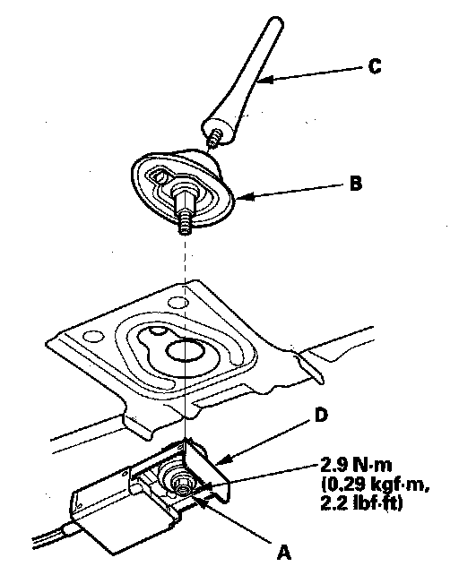 2. Loosen the mounting nut (A), then remove the AM/FM antenna (B) and antenna element (C) from the AM/FM antenna amplifier (D).