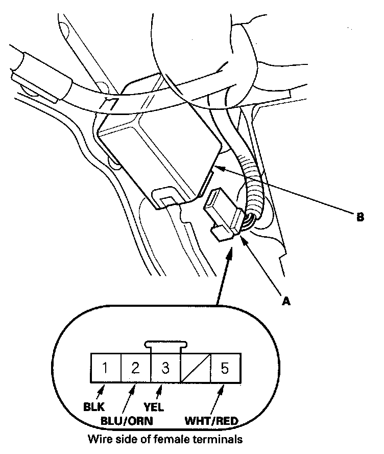 3. Disconnect the 5P connector (A) from the keyless receiver unit (B).