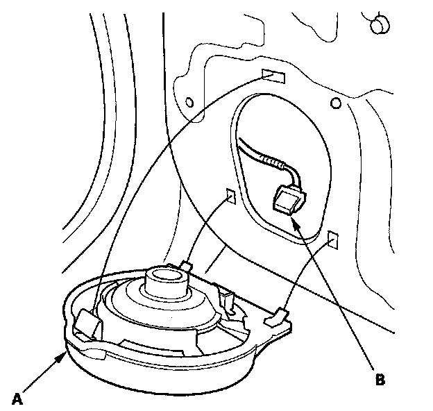2. Disconnect 2P connector (A) from the tweeter (B).