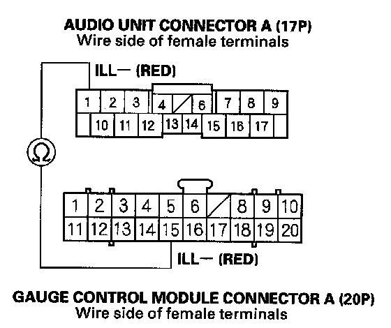 8. Check for continuity between audio unit connector A (17P) No. 1 terminal and gauge control module connector A (20P) No. 15 terminal.