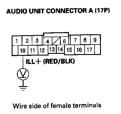 10. Check for voltage between audio unit connector A (17P) No. 10 terminal and body ground.