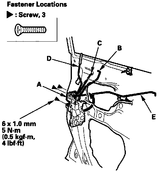 6. Remove the screws, then remove the latch (A) through the hole in the door. Take care not to bend the outer handle rod (B), cylinder rod (C), lock knob rod (D), and inner handle rod (E).