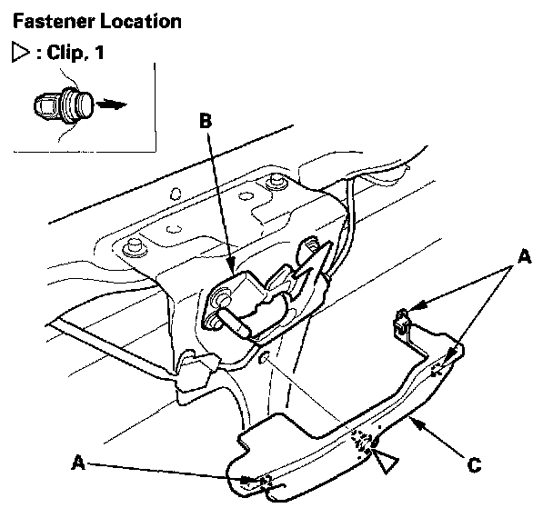 2. Detach the clip, and release the hooks (A) from the hood latch (B), then remove the hood latch cover (C).