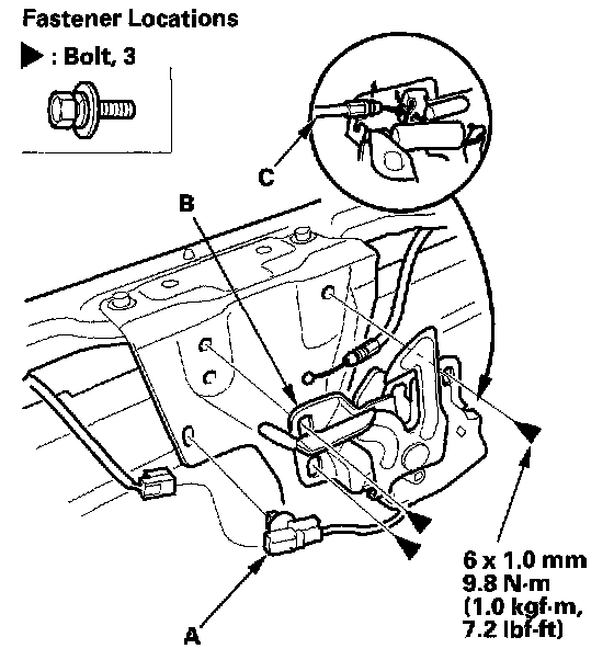 4. Remove the bolts, then remove the hood latch (B) from the body, and disconnect the hood opener cable (C) from the hood latch. Take care not to kink the cable.