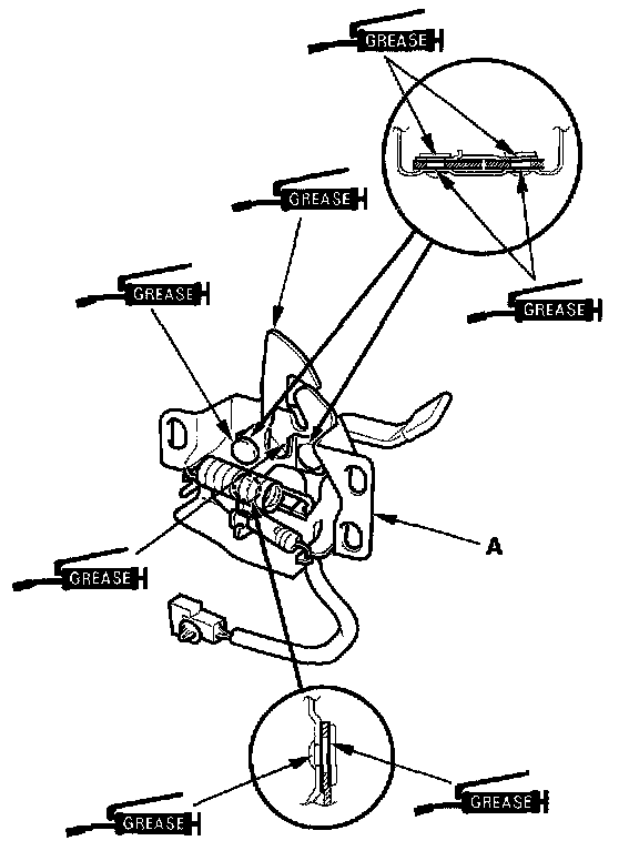 - Apply multipurpose grease to each location of the hood latch (A) indicated by the arrows.