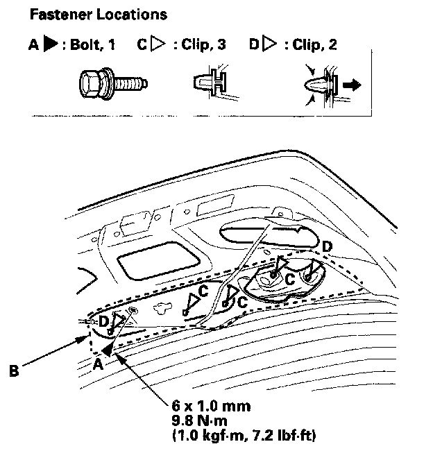 - Do not roll up the lip (B) of the rear window rubber dam. If necessary for proper attachment, set a plastic plate between the lip and trim. Install the top edge of the trim while sliding a plastic plate sideward. Be careful not to cut the lip.