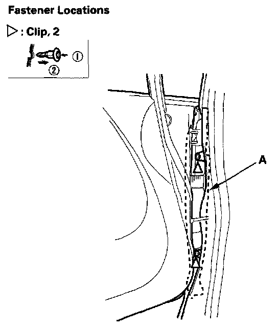 2. Open the front door. From inside the door, remove the clips securing the front fender fairing (A) and front fender.