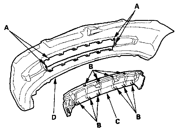 3. Detach the hooks (A, B), then remove the lower front bumper grille (C) from the front bumper (D).