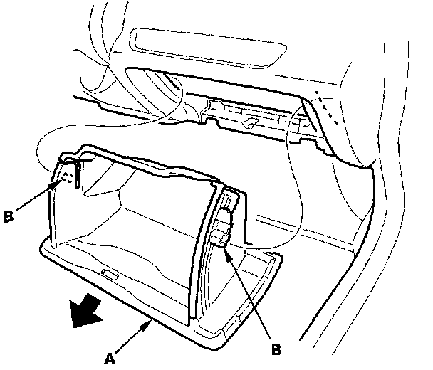 2. While holding the glove box (A), release the glove box stop (B) on each side from the dashboard by pushing them in, then remove the glove box.