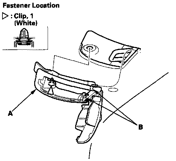 2. Detach the clip, then remove the child seat tether anchor cap (A) by releasing the hooks (B).