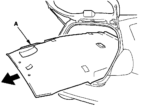 4. With the help of an assistant, pull the headliner (A) out through the tailgate opening. Do not bend the liner. Bending the liner will crease and damage it.