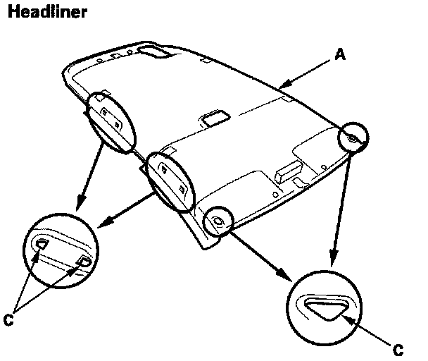 - Any damage around the grab handle holes (C) or sunvisor holes in the headliner