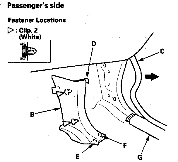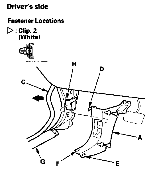 2. Pull the kick panel back by hand to detach the clips, and to release the hook (E) and tab (F) from the front door sill trim (G), then remove the panel. On the driver's side, pull the hood opener knob (H) and hold it while removing the panel.