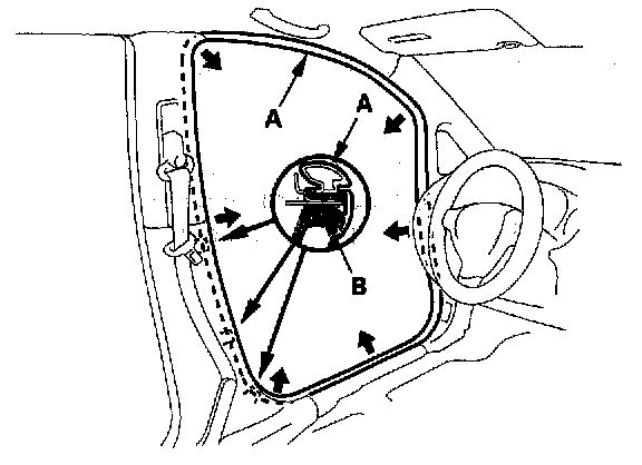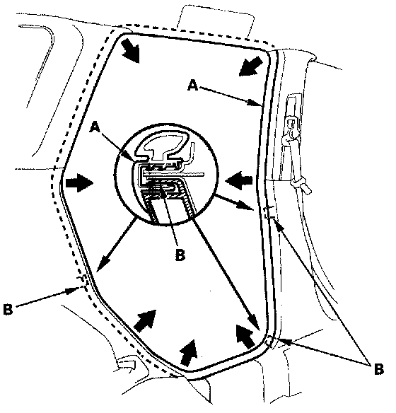 3. Pull out the front door inner seal (A) from the trim hooks (B) and around the front door opening flange, then remove the seal.