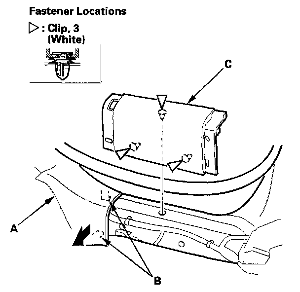 5. Pull the front door sill trim (A) up by hand to detach the clips, and release the hooks (B) from the slits in the carpet (C), then remove the trim.