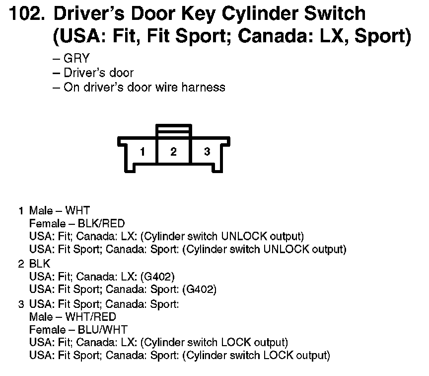 102. Driver's Door Key Cylinder Switch (USA: Fit, Fit Sport; Canada: LX, Sport):