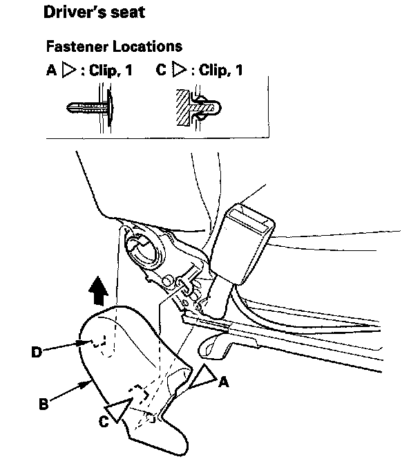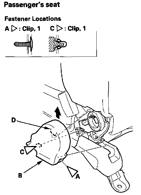 3. Remove the screw (C) on the passenger's seat, and release the rear clip (D) on each side seat.