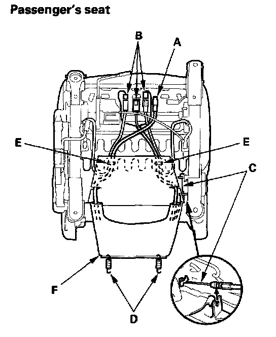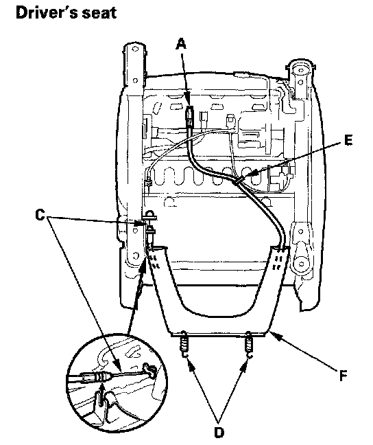5. Disconnect and/or detach the side airbag connector clip (A) on each side seat, and the ODS subharness connectors (B) on the passenger's seat. Disconnect the slide cable (C). Release the hook springs (D), and remove the wire tie(s) (E), then pull the harness guide (F) back.