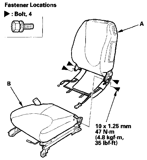 7. Remove the bolts, then separate the seat-back (A) and the seat cushion (B).
