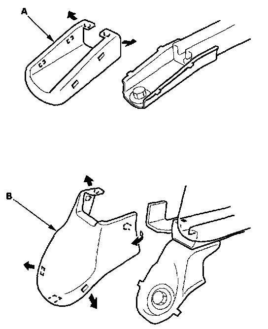7. Remove the front inner seat track end cover (A) and front outer seat track end cover (B) from the front of both seat tracks.