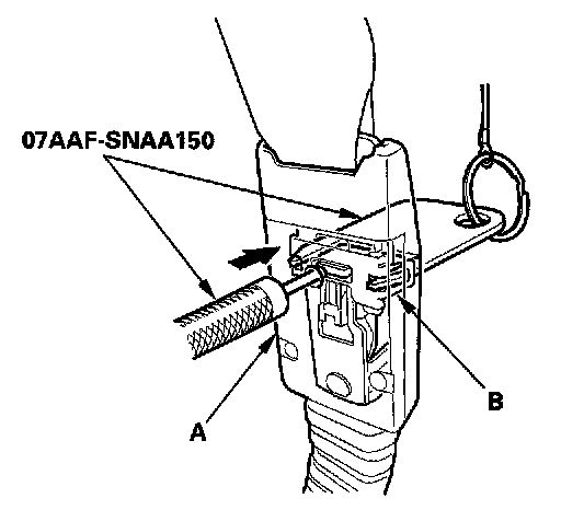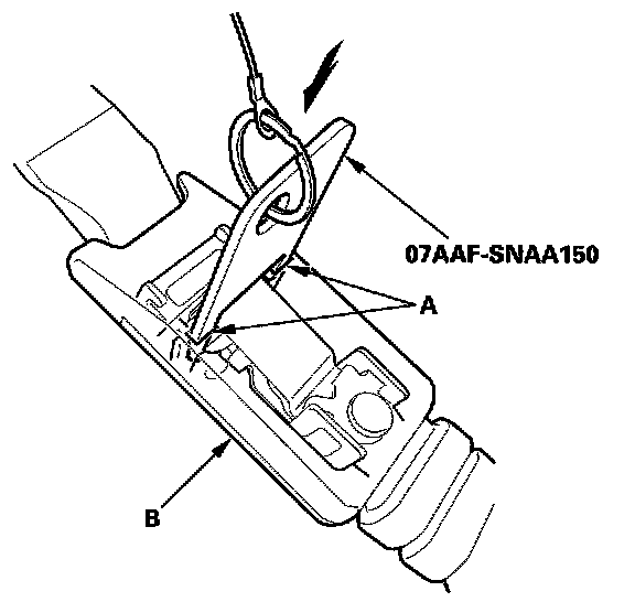 4. Slowly insert the seat belt disassembly tool plate into holes (A) in the back of the lap connector cover (B).