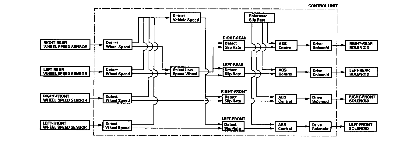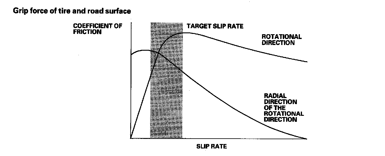 Without ABS, when the brake pedal is pressed while driving, the wheels sometimes lock before the vehicle comes to a stop. In such an event, the maneuverability of the vehicle is reduced if the front wheels are locked, and the stability of the vehicle is reduced if the rear wheels are locked, creating an extremely unstable condition. With ABS, the system precisely controls the slip rate of the wheels to ensure maximum grip force from the tires, and it thereby ensures maneuverability and stability of the vehicle. The ABS calculates the slip rate of the wheels based on the four wheel speeds, then it controls the brake fluid pressure to reach the target slip rate.