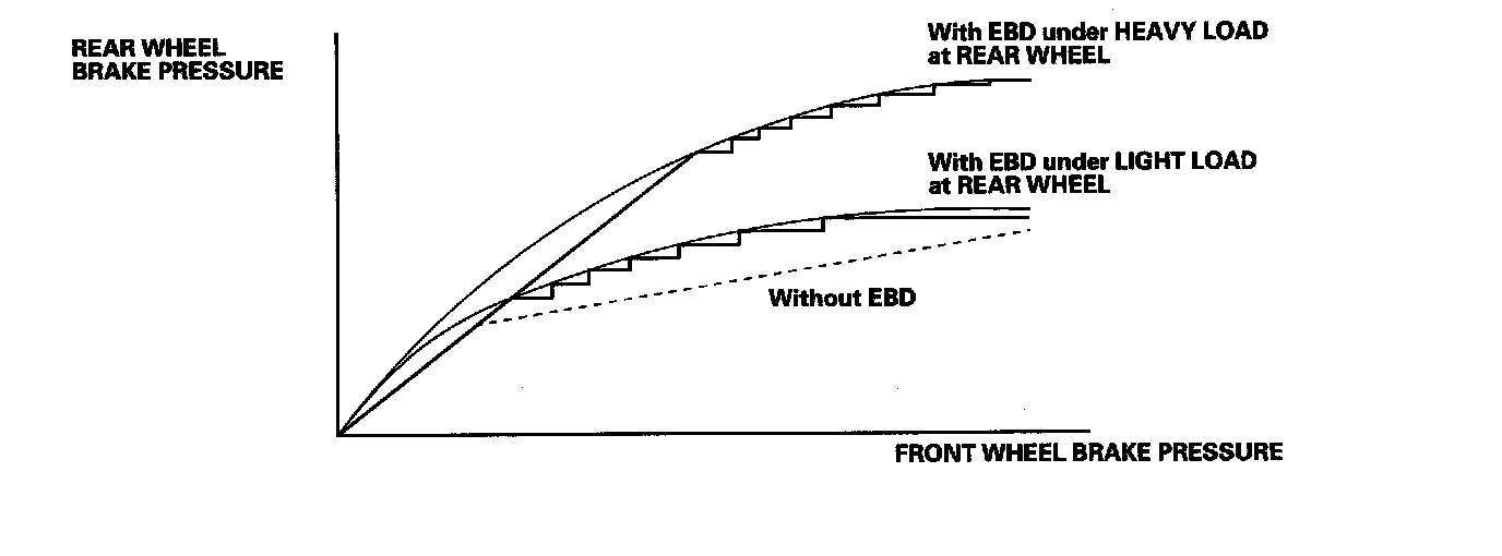 The electronic brake distribution (EBD) feature helps control vehicle braking by adjusting the rear brake force in accordance with the rear wheel load before the ABS operates. Based on the wheel speed sensor signals, the control unit uses the modulator to control the rear brakes individually. When the rear wheel speed is less than the front wheel speed, the ABS modulator-control unit retains the current rear brake fluid pressure by closing the inlet valve in the modulator. As the rear wheel speed increases and approaches the front wheel speed, the ABS modulator-control unit increases the rear brake fluid pressure by momentarily opening the inlet valve. This whole process is repeated very rapidly. While this is happening, there is kickback at the brake pedal.