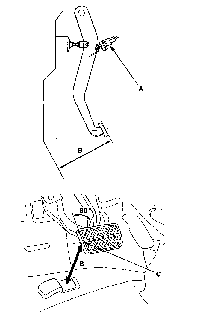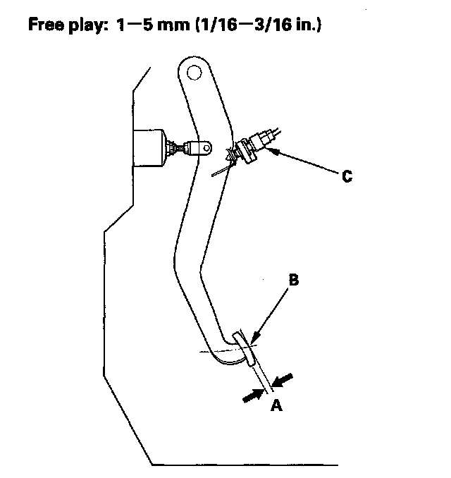 2. If the pedal free play is out of specification, adjust the brake pedal position switch (C). If the pedal free play is insufficient, it may result in brake drag.