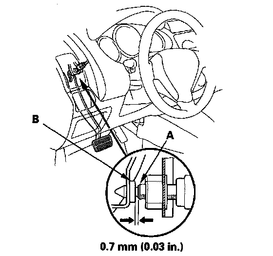 4. Lift up on the brake pedal by hand. Push in the brake pedal position switch until its plunger is fully pressed (threaded end (A) touching the pad (B) on the pedal arm). Then, turn the switch 45° clockwise to lock it. The gap between the brake pedal position switch and the pad is automatically adjusted to 0.7 mm (0.028 in.) by locking the switch. Make sure the brake lights go off when the pedal is released.