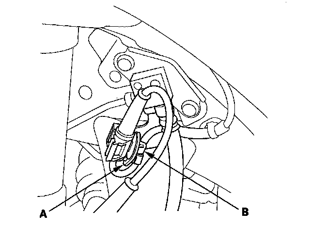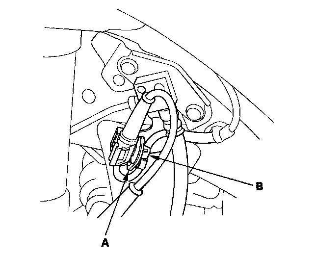 2. Remove the wheel sensor harness clip (B) from the brake hose mounting bracket A. Do not disconnect the wheel sensor connector.