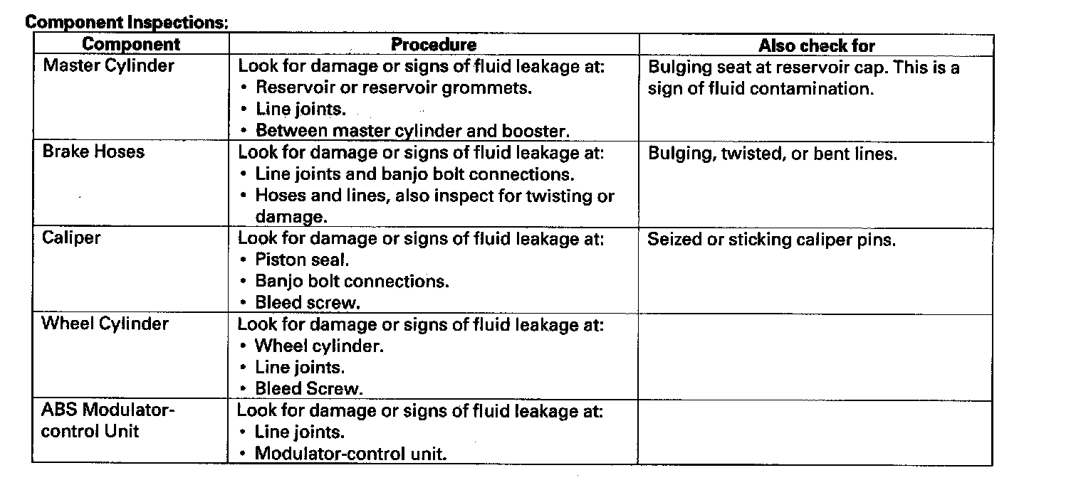 Brake System Inspection and TestInspect the brake system components listed. Repair or replace any parts that are leaking or damaged.