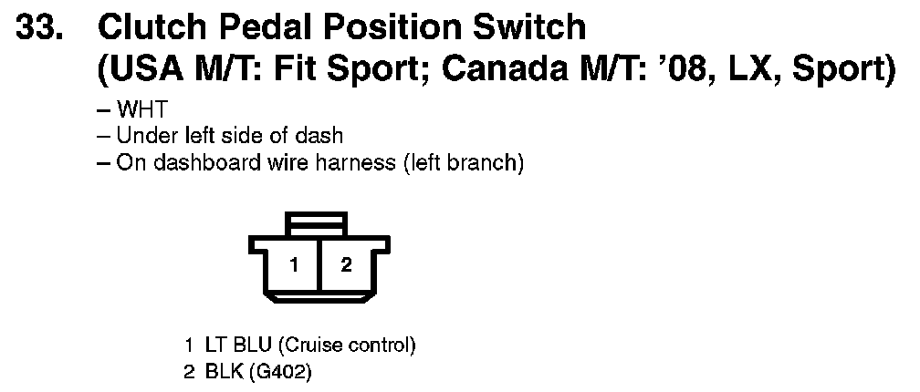 33. Clutch Pedal Position Switch (USA M/T: Fit Sport; Canada M/T: '08, LX, Sport):