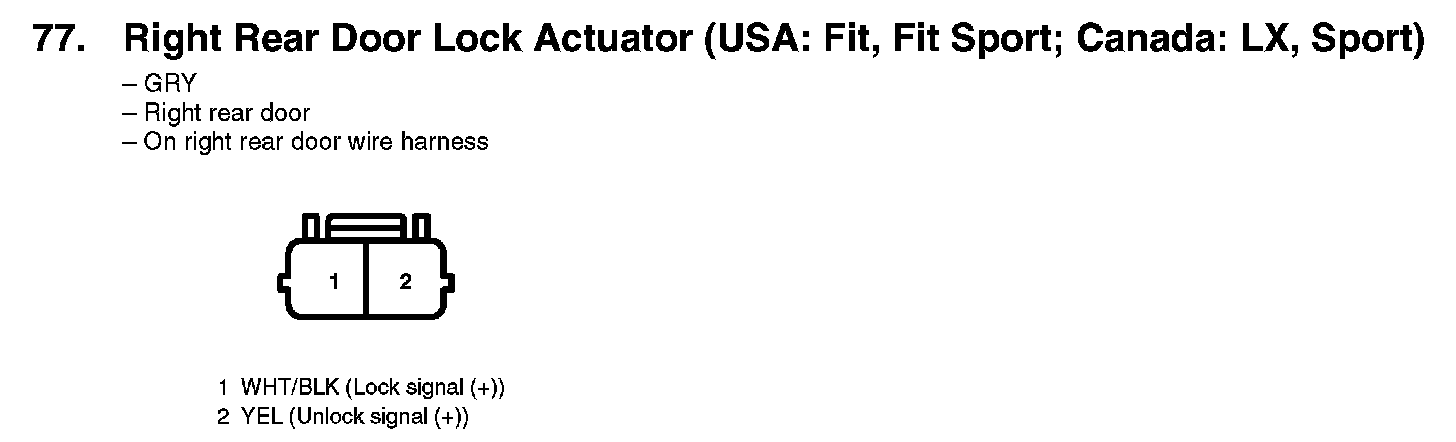 77. Right Rear Door Lock Actuator (USA: Fit, Fit Sport; Canada: LX, Sport):