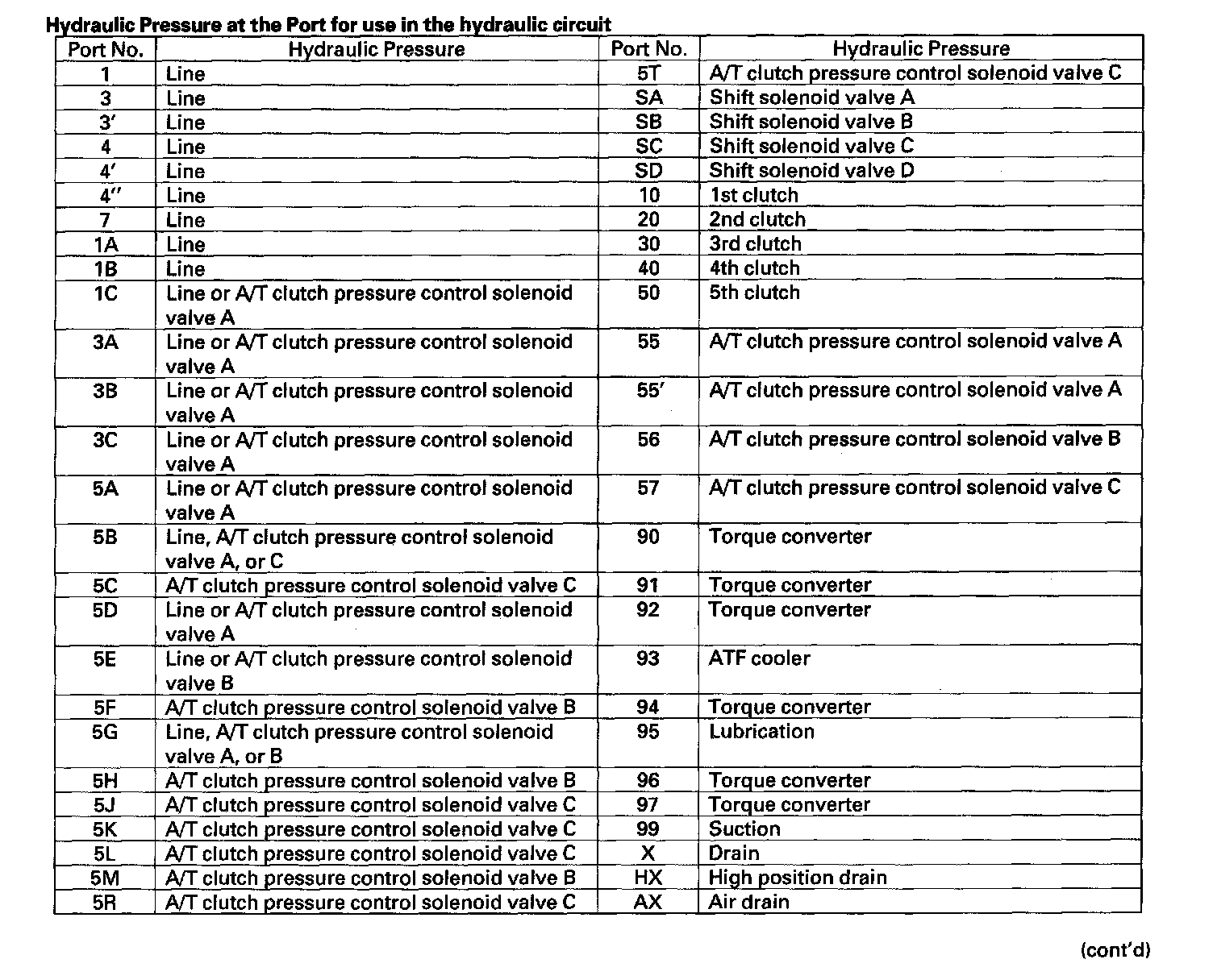 When shifting into R from P or N, line pressure (1) becomes line pressure (1), (3), and (7) at the manual valve. The PCM turns shift solenoid valve D ON, and shift solenoid valves A, B, and C OFF. Shift solenoid valve D pressure (SD) is applied to the left end of shift valve D, and shift valve D is moved to the right side to uncover the line pressure (3) port leading to the servo valve. Line pressure (3') from shift valve D flows to the servo valve, and pushes the servo valve to the reverse position. The PCM controls A/T clutch pressure control solenoid valve A to regulate A/T clutch pressure control solenoid valve A pressure (55), and A/T clutch pressure control solenoid valve A pressure (55) flows to the lock-up shift valve, shift valve B, the manual valve, the servo valve, shift valve D, and cut valve A. A/T clutch pressure control solenoid valve A pressure (3C) becomes 5th clutch pressure (50) at cut valve A. 5th clutch pressure (50) is applied to the 5th clutch, and the 5th clutch is engaged with the A/T clutch pressure control solenoid valve A pressure mode.