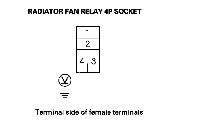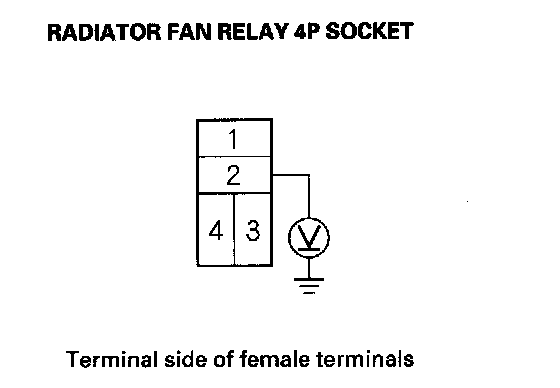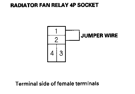 8. Disconnect the jumper, and turn the ignition switch ON (II). Check for voltage between the radiator fan relay 4P socket terminal No. 4 and body ground.
