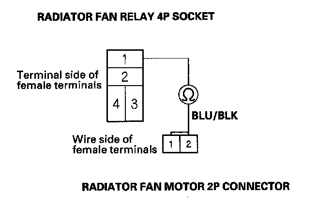 6. Check for continuity between the radiator fan relay 4P socket terminal No. 1 and the radiator fan motor 2P connector terminal No. 2.